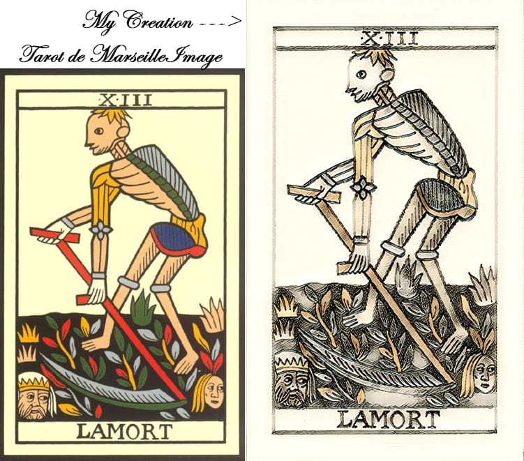 The original version of the Marseille Tarot was published in Paris circa 1650 by master card-maker Jean Noblet. The Noblet deck is known for having the title LAMORT (Death) on the XIII Major Arcana card whereas most of the other Tarot de Marseille decks have the card numbered but unnamed, e.g., Jean Dodal Tarot (circa 1701) and Nicolas Conver Tarot (circa 1761).
